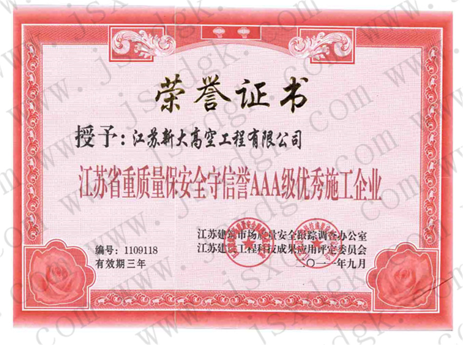 江蘇省高空行業五十強行業證書
